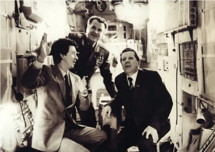 Космонавт-исследователь Атьков О.Ю., летчик-космонавт, дважды Герой Советского Союза Шаталов В.А. и академик Чазов Е.И. обсуждают программу медицинских исследований предстоящего полета, разработанную совместно ИМБП и ВКНЦ