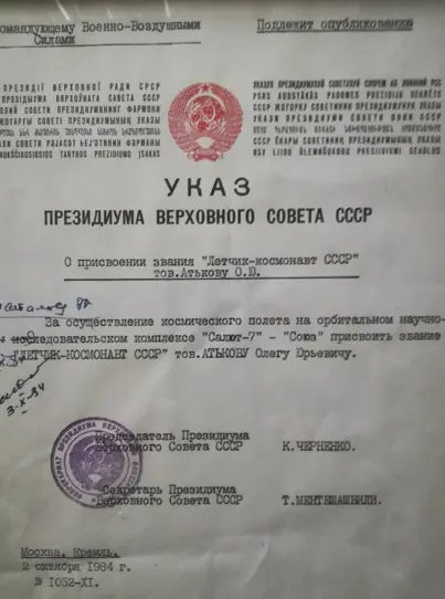 2 октября 1984 года Указом Президиума Верховного Совета СССР космонавту-исследователю, старшему лейтенанту запаса медицинской службы Атькову Олегу Юрьевичу было присвоено звание Героя Советского Союза с вручением Ордена Ленина и медали «Золотая Звезда».