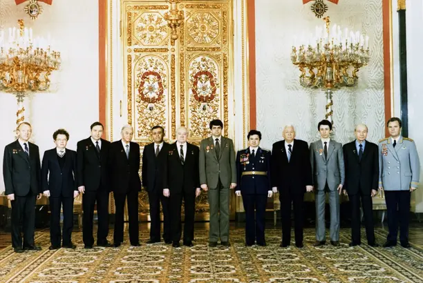 Вручение в Кремле экипажу «Салют Т-10» Государственных наград. В центре - В.Соловьев, Л.Кизим, Председатель Президиума Верховного Совета К.У.Черненко, О.Ю.Атьков